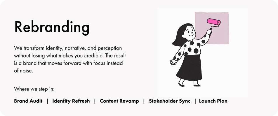 We transform identity, narrative, and perception without losing what makes you credible. The result is a brand that moves forward with focus instead of noise.