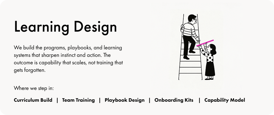 We build the programs, playbooks, and learning systems that sharpen instinct and action. The outcome is capability that scales, not training that gets forgotten.