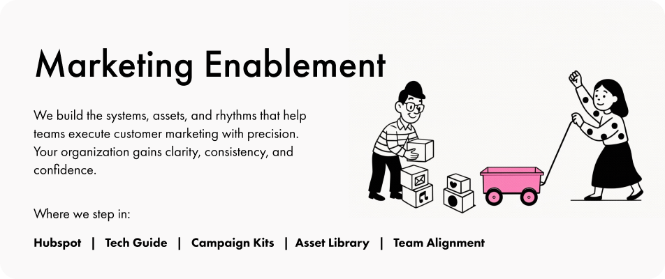 We build the systems, assets, and rhythms that help teams execute customer marketing with precision. Your organization gains clarity, consistency, and confidence.